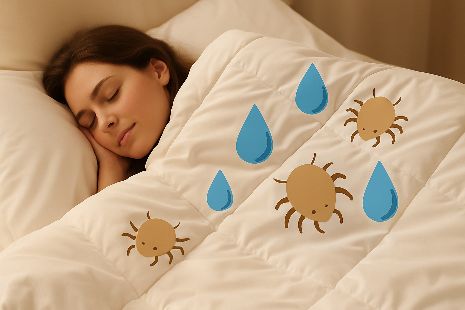 Das Resultat: Ihr Körper schwitzt nachts, die Feuchtigkeit bleibt im Stoff gefangen, Milben fühlen sich wohl und produzieren Allergene durch ihren Kot. Sie wachen morgens mit gereizter Haut, verstopfter Nase und dem Gefühl auf, als hätten Sie gar nicht geschlafen.