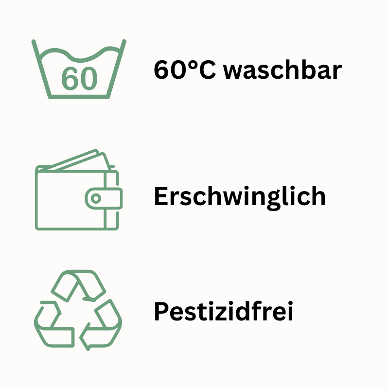 Bio-Baumwolle ist der unkomplizierte Klassiker: Sie ist robust, bei hohen Temperaturen waschbar, trocknergeeignet und verzichtet auf Pestizide. Die Faser ist vertraut, weit verbreitet und angenehm weich auf der Haut.